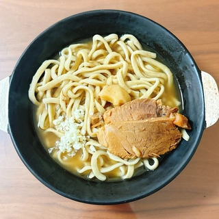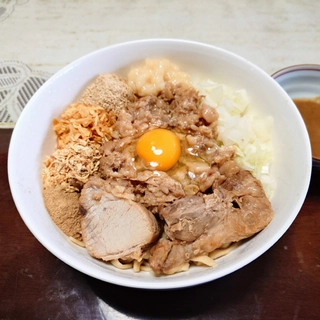 ベースのたれは濃厚豚骨醤油で、 ソースやペーストに近いもの。 麺は低下水の極太縮れ麺で、 茹で時間5分としっかりめに茹でてデロ麺寄りに。 豚はゴロりとした大きな腕肉が2塊ほど。 付属トッピング以外に、刻み玉ねぎ、生卵、 フライドオニオン、白ごま、お酢、辣油を用意。 序盤は混ぜながら自然な味変を楽しみつつ食す。 大量のブタカスアブラ効果でかなりオイリー。 濃いめのたれのパンチはありつつも、 全体的にはまろやかな味わい。 中盤に極悪汁を少し舐めて味の確認。 その名の通り塩分の塊のような味なので、 つけ麺風にして啜るとイイ感じ。 終盤にお酢と辣油で引き締めて完食。 胃のキャパに余裕がある方は追い飯もアリ。 そのほか紅しょうが、ガリマヨ、ニラキムチ等を 用意できる方はそれもアリ。