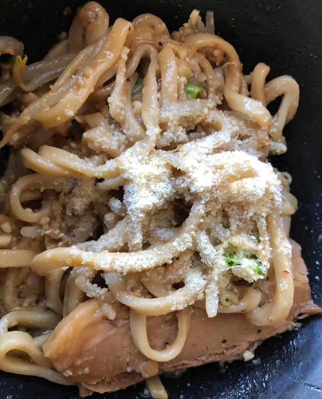途中から追加した粉チーズを混ぜるとさらにジャンキーに味変し、フライドオニオンやニンニクと混ざって半固形状になったタレまで残さず食べて、完食です。