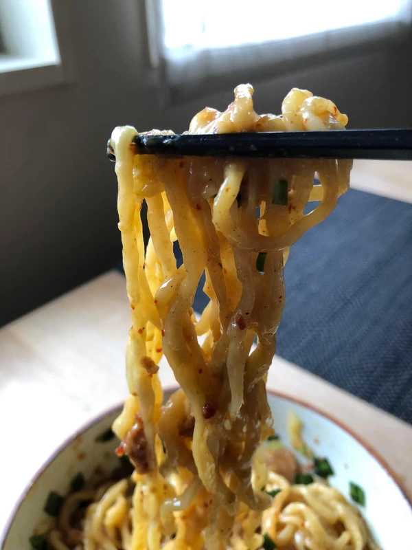 濃厚煮干そばの名店ならではの、煮干をベースとした濃厚なタレ。そこに加わるのが、上質な背脂をたっぷりと含んだ辛味噌。甘み、辛み、旨味が見事三位一体となり、口の中で融合する。複雑、かつ深みのある味わいは、食べ進めるほどに、新しい食感、香り、味を感じ取ることができ、あっという間に完食してしまうこと請け合いだ。この商品の何よりの特徴は、とにかく中毒性が高いこと。食べたらわかる、この中毒性!
