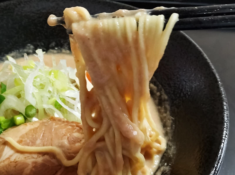 麺はグッチリとした強い食感のストレート中細麺で、鶏ポタスープにしっかり絡んで持ち上げます。