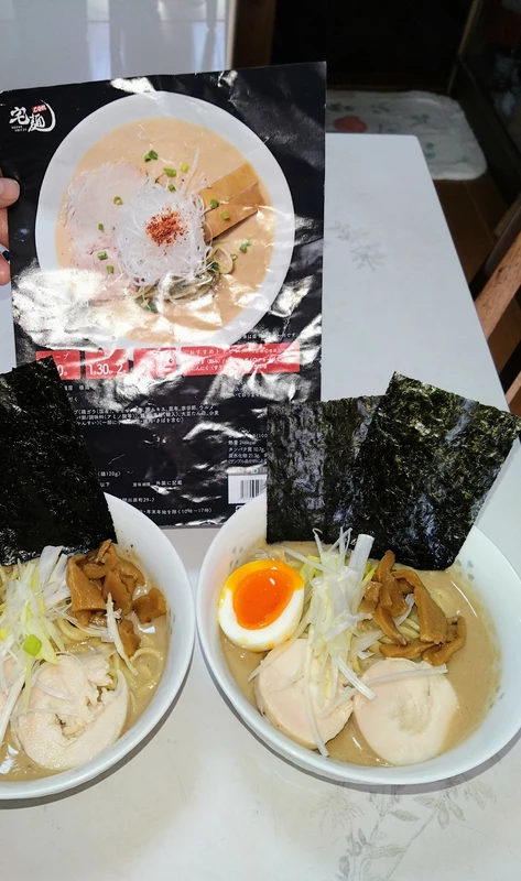 追加トッピングは玉子、メンマ、白髪ねぎ、自家製鶏ハム、海苔(写真は他の宅配麺と味比べの為1つを2杯に分けてます)