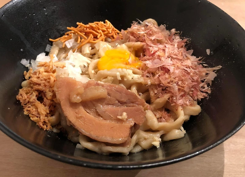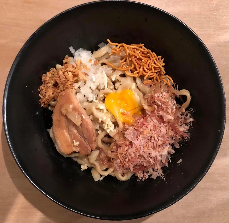 追加トッピングはキャベツとモヤシと生卵、そしてニンニク。まず麺が素晴らしい。ウネリの強い極太麺はラーメンと共通だが、短い時間でバキバキに仕上げても良いし、やや長めに茹でてグニュモチ食感にしても美味い。豚は味染みが良くとても柔らかいがやや小ぶりなのが残念。タレがとても美味しくマイルドで、付属のかつお節ととても相性が良い。今回マヨネーズを使用しなかったので、ジャンクというよりはとても上品に頂くことが出来た。