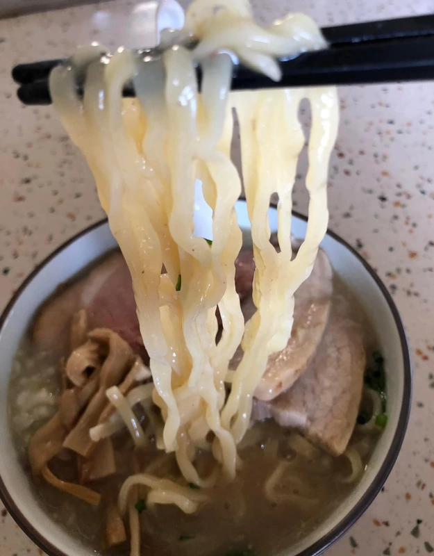 麺はツルツルでプルプルのモチモチな平打太麺。麺はしっかり5分以上茹でたほうがよいです。鶏白湯との相性があり、下手にカタメにするとスープを拾わず味がボケて感じるようになります。