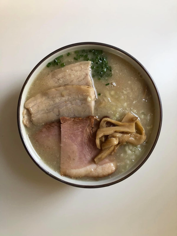 トロミのある白湯スープは鶏の旨味が十分に感じられ、塩味とのバランスも良く後味もスッキリしています。平麺はモチモチでスープに良く絡みます。2枚のチャーシューも良い味付けです。オススメトッピングのネギは加えましたが、キクラゲも良く合うのではないかと思います。