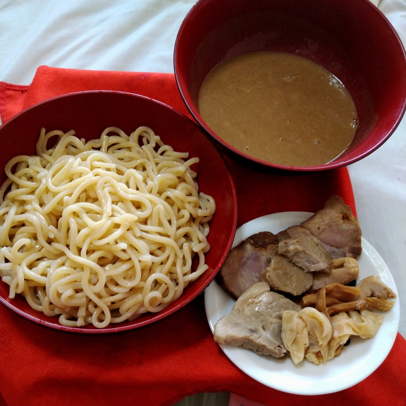 追加トッピングはネギとタマネギと海苔。中太の麺は指定茹で時間リミットの8分で調理。小麦の風味が良くしっかりとした歯応えでつけ汁と良く絡む。具材は柔らか過ぎるくらいの豚チャーシューと、香ばしく適度な噛み応えの鶏チャーシュー。そしてコリコリ食感のメンマと、優しく柔らかい筍ゆばのトッピング。商品価格は高めだが、豊富な具材を考えれば納得できる。つけ汁は豚と鶏の動物系出汁に節や煮干しの魚介を合わせた有りがちな構成だが、魚介のエグミ苦味を加えた事で個性が生まれた。決して嫌味なビターでは無い、万人タイプではある。