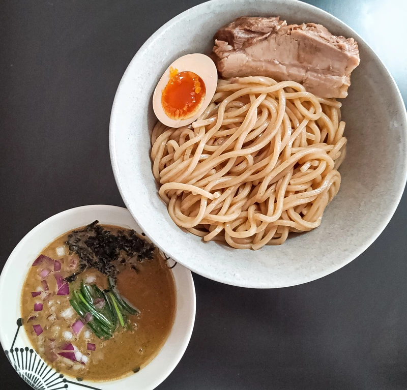 追加トッピングはネギと海苔。麺は中太寄りの太麺で小麦の香り良く、茹で時間10分で調理したがコレがとてつも無く美味い。具材の豚は厚みがありつつも柔らかくジューシーな仕上がり。欲を言えばメンマのトッピングも欲しかった所。つけ汁は塩味が強めで煮干しの風味も強い。甘みに頼らない、煮干しのビターなエグみがとても印象的で食欲をそそる仕上がりになっているので苦手な方も居るだろう。