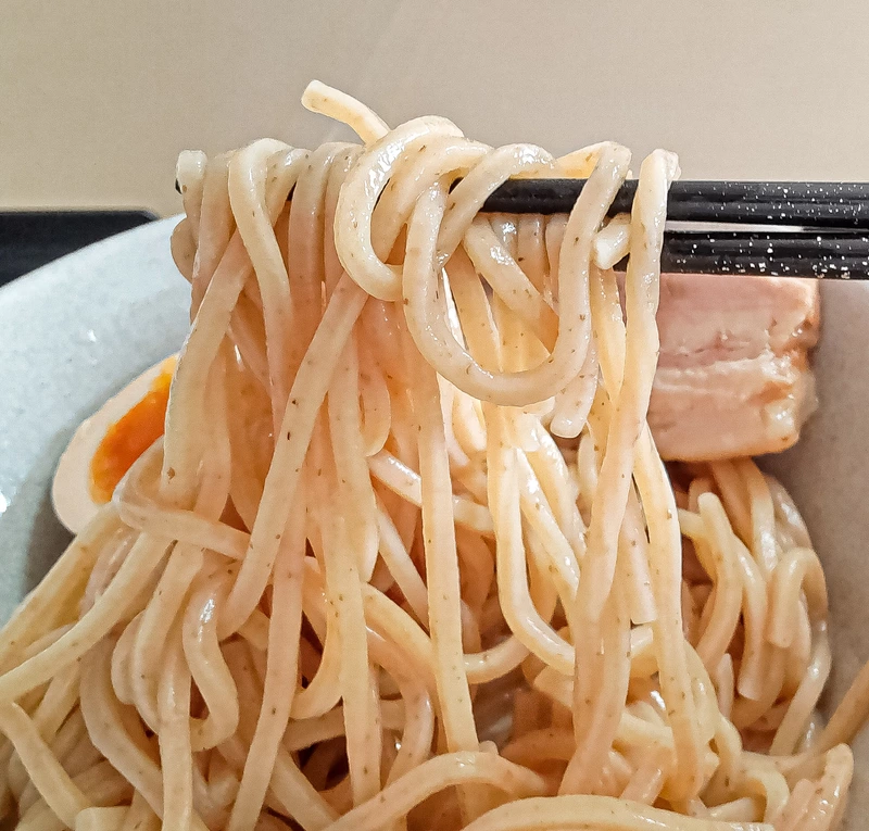 煮干しの香り漂うつけ汁は動物系が加わることにより、円やかさと煮干し特有のエグ味も感じられず旨味が前面に出て、煮干しが苦手な方でも食べやすい仕上がりになっています。
