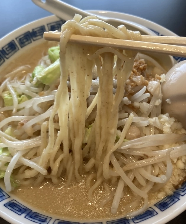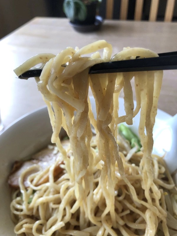 麺は全粒粉入りの中加水角刃中太ストレート。ワイド型の緩ウェーブで、インスパ系では珍しい細さ。
