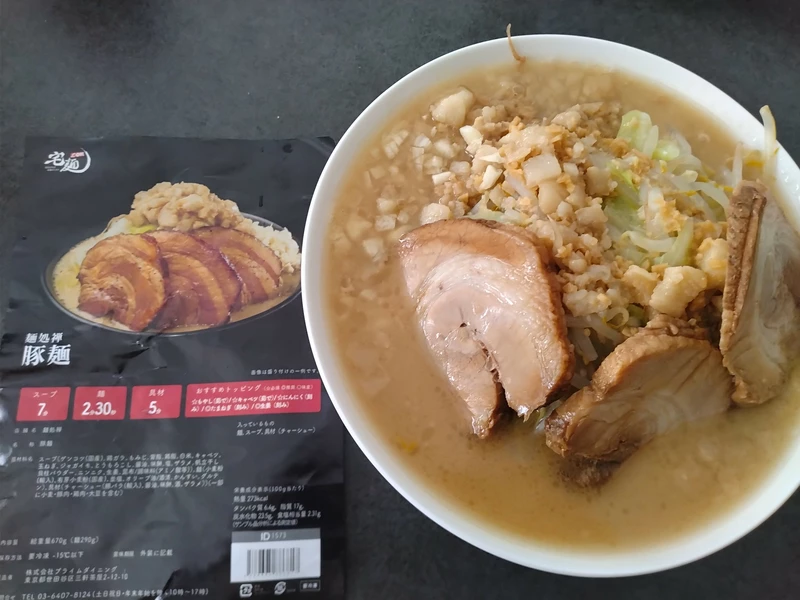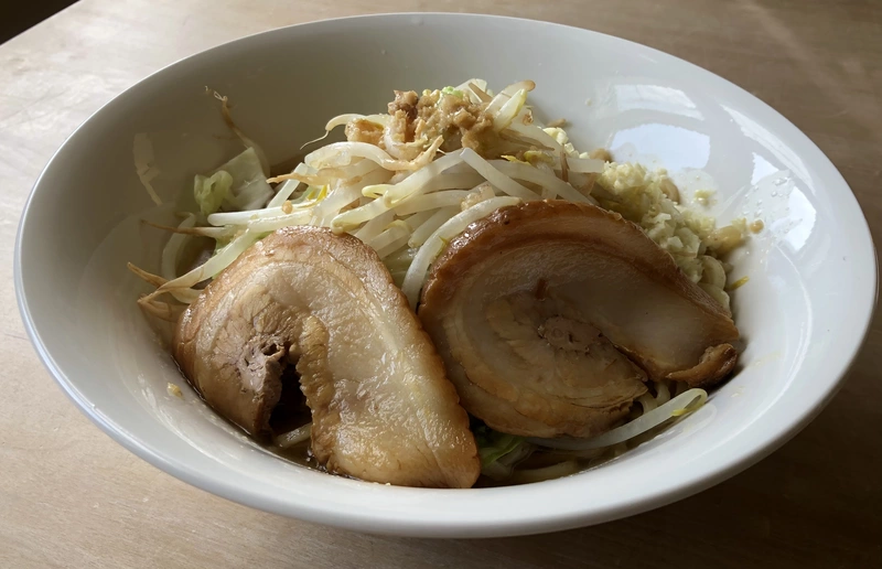 追加トッピングはモヤシとキャベツ。ビジュアルは二郎インスパイア系に見えるが麺は細めだし、スープはニンニクの良く効いた醤油豚骨でどちらかと言えばラーショ的な印象。脂が重い印象は無いが、塩味ガッツリでとても飲めるレベルでは無い故にモヤシは多めで良いと思う。具材の豚が柔らかく煮込まれおり秀逸な出来で、スープと別袋になってるのが嬉しいポイント。じゃない感が気にならない方ならとても満足な一杯だと思う。