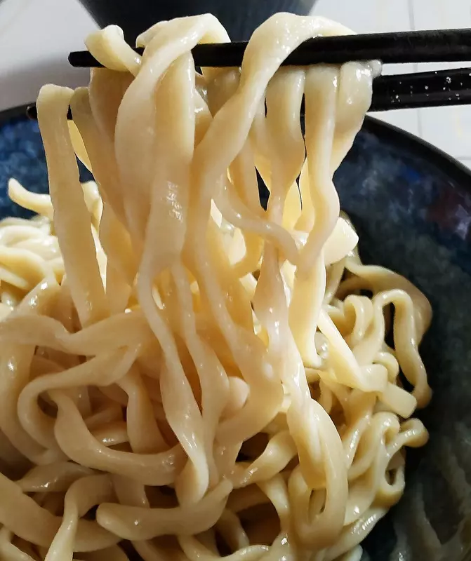 もっちりとした食べ応えある自家製極太麺は、平たい形状にわずかにウェーブがかかっており、スープを豪快にすくいあげてくれる。弾力があり、噛めば噛むほどに、小麦の甘みを感じることができる。つけめんでは、麺の旨み、凄みをそのままダイレクトに味わうことができ、昆布水につけた麺をそのまま喰らうのもオススメだ!スープのインパクトに負けない力強い麺で、ボリュームも満点なので食べ終わった後の満足度はすこぶる高い。