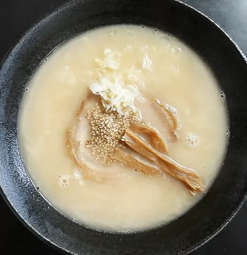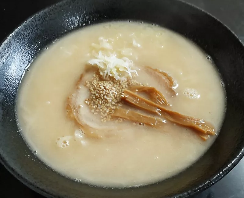 修行先で賄いを食べた際に思いついたという、ごまらーめん。雑味がなく、すっきりとしたクリーミーな口当たりが特徴。ごまの香りがとても強く、鶏ガラと野菜を中心に丁寧に抽出した優しい味わいのスープとの相性は抜群。サラリとした粘度の低いタイプのスープながらも、麺との絡みは非常によく、スープだけ飲んでも、麺に絡めて食べても、至高の味わいでスープを飲み干してしまうこと間違いなしの逸品だ。