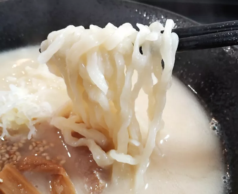 佐野らーめんといえば、モチモチ食感の手揉みちぢれ麺!一乃胡の自家製麺も、加水率高めでみずみずしさを兼ね添えた、繊細にして、非常に口触りが良いのが特徴だ。また、豚バラを使った大判のチャーシューは肉厚で柔らかく、シューシー。脂身に甘みがあるので、やさしい口あたりのスープによく馴染む。