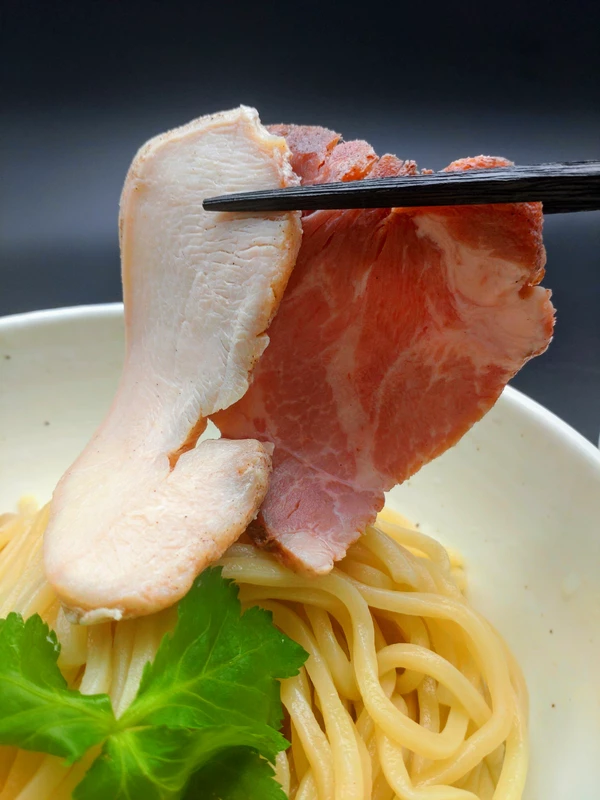 キラキラと艶のある麺は地元栃木の製麺所「磯屋商店」の特注麺を使用している。モチモチした食感が特徴的で甘みのある味わいと共に華やかな小麦の香りが噛むごとに口の中に広がる仕上がりとなっている。またチャーシューは豚肩ロースと鶏胸肉が贅沢に2種類トッピングされており、低温で調理されているため、肉質が良く、スープとの相性も抜群だ。