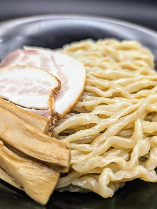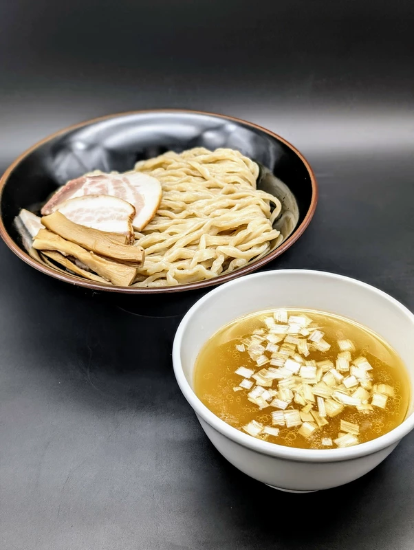 黄金色に輝くつけ汁は『進化』のトレードマークである塩への拘りが強く表されている。クリアなビジュアルながらパンチのある麺に負けないよう、スープの濃度を調整し、ガツんとした印象のキレのある味わいだ。動物系の出汁をベースに魚介のエッセンスもありつつ、塩ダレがしっかり引き締めることで食べ飽きることのない仕上がりとなっている。チャーシューはタレに2日間漬けたバラ肉を吊るし焼きにしたものが使用されており、程よい薫香が食欲をそそる逸品だ。
