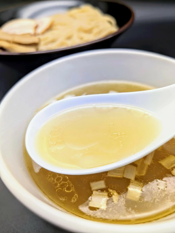 つけ汁の塩分濃度は約2.5%とつけ麺としては概ね平均的〜若干淡めですが、この昆布水を纏った麺と合わせると、