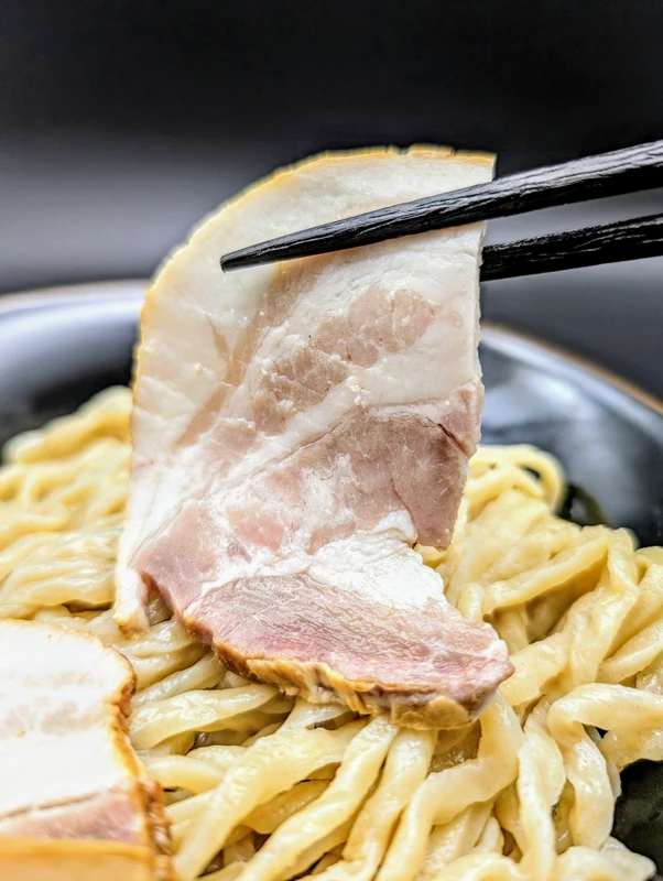 脂身の多いバラ部位ですが、常温でもあっさりしており、脂の甘味とスモーキーな風味が麺とマッチしています。