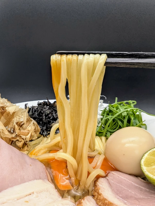 冷たく締める事によりツルツルの瑞々しい麺肌とムッチムチの強い弾力が生まれます。