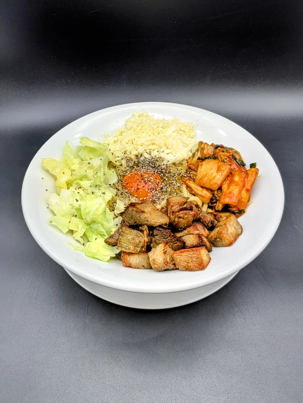 お好みで茹でキャベツ、キムチ、チャーシューなどを加えて頂く、熱々の釜玉スタイルとなっています。