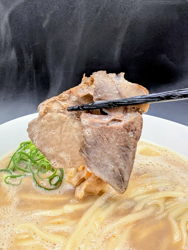 付属トッピングはInスープの豚肩肩ローススライスが2枚。実店舗と異なる煮豚タイプで、適度な弾力と味付け。