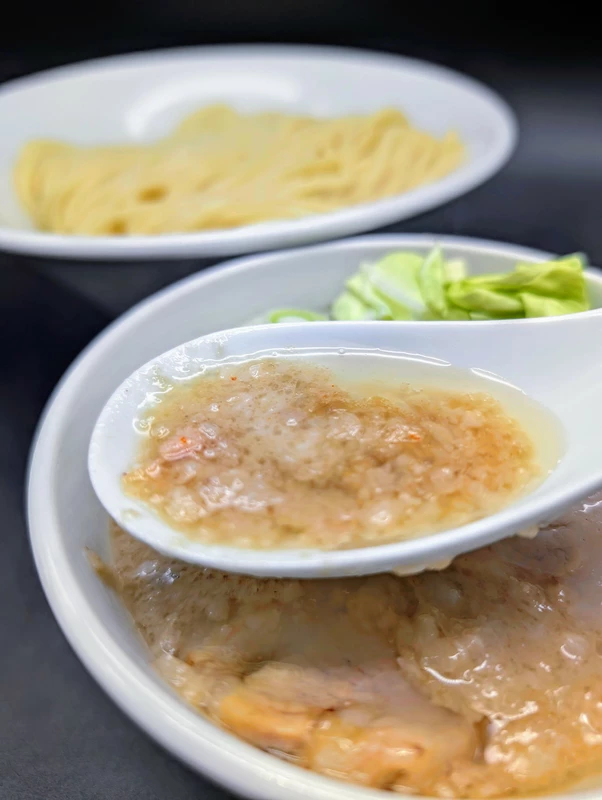豚の旨味が凝縮されたつけ汁は大量の背脂の甘味と強い塩味がパンチのある仕上がりとなっています。中太ストレート麺は適度な歯応えとモチモチ感で喉越しも抜群です。バラチャーシューは柔らかく、メンマはシャキシャキです。おすすめトッピングの刻み長ねぎを加え、食べ終えた後は店主のワンポイントアドバイスに従っておじやにして堪能しました。