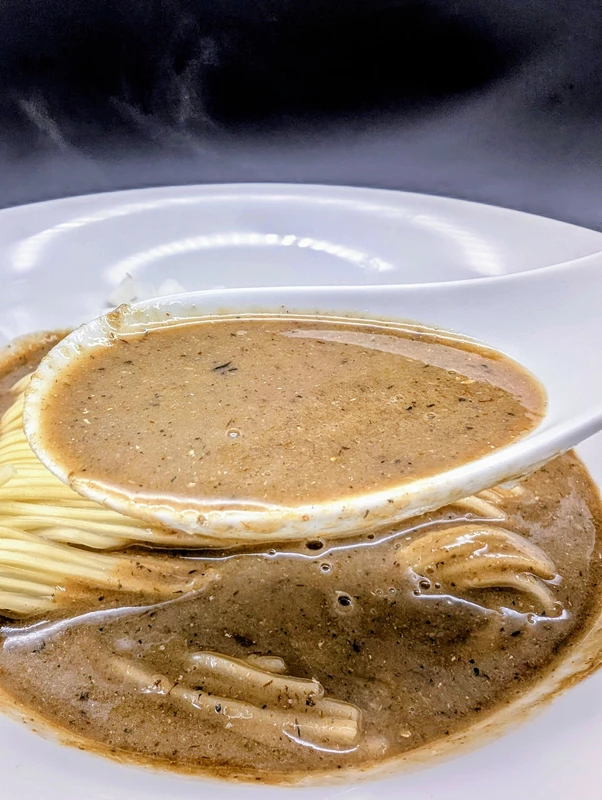 噂通りのドロドロ濃厚なスープです。豚骨スープの重厚感に、煮干しの風味を溶かし込んだスープで、煮干し好きな人には踊り狂うほど完成度の高いラーメンです。