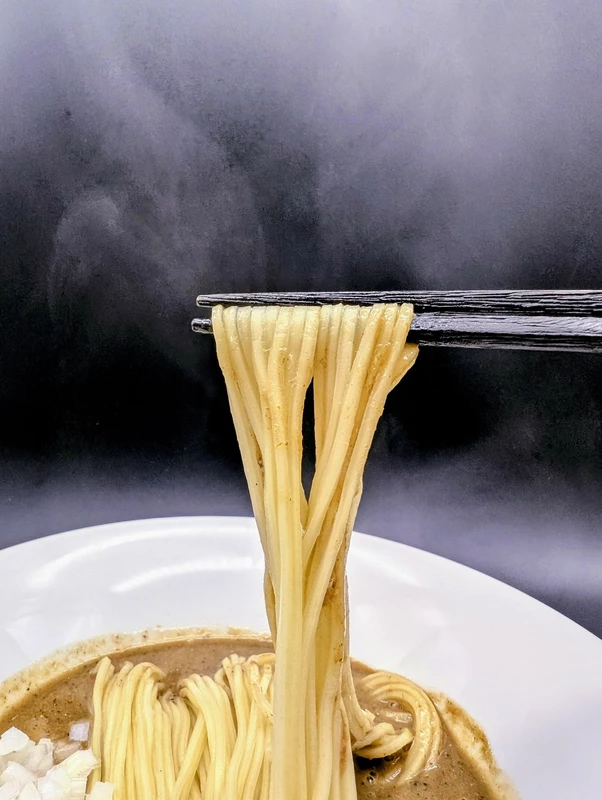 ドロスープをガッチリと持ち上げ、しなやかでコリパツの食感が煮干とマッチし、麺の持つ小麦の甘味がお互いを引き立て合っています。