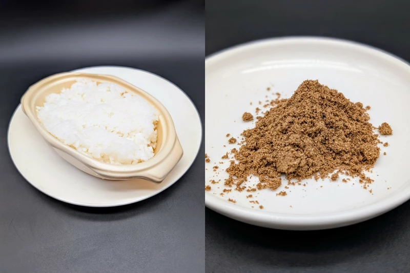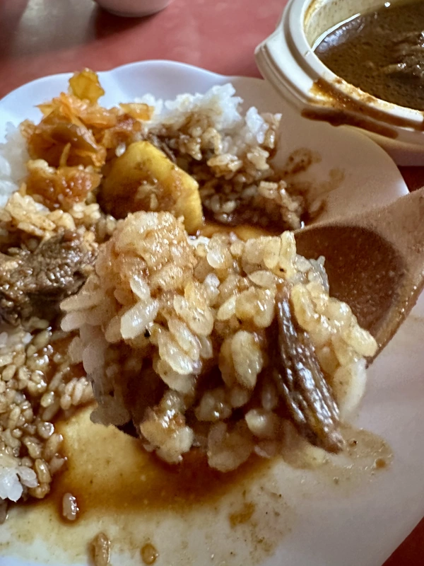 ライスは辛口のカレーと相性の良い甘味の強いジャポニカ米を使用し、シャバシャバのカレーに合わせてやや硬めに炊かれています。