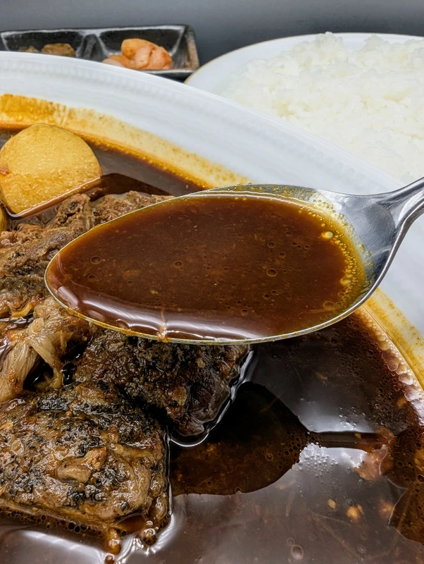 また艷やかで黒みを帯びた色合いをしていますが、こちらは金沢カレーと同じようにカラメルと玉葱などで色味が付けられています。