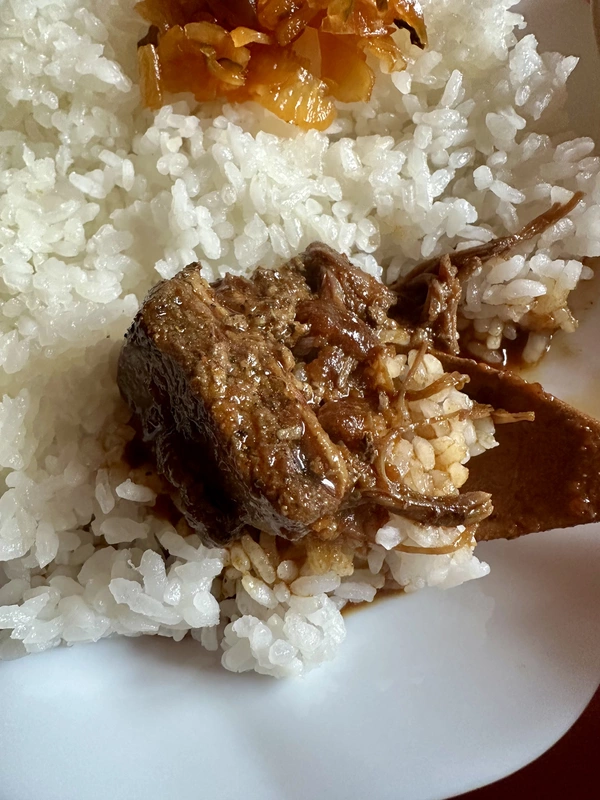 具材は黒胡椒の効いたスパイシーな牛のトモバラ肉が大きなぶつ切りで4〜5個ほど別パックに入っており、赤身は噛み応えを残しつつ脂身はトロトロに軟らかく煮込まれています。