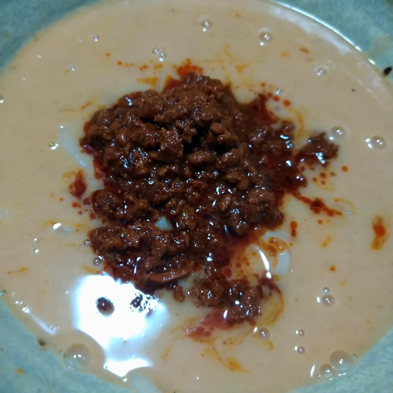 【めん】小麦粉(国内製造)、食塩、卵白粉/酒精、加工デンプン、かんすい、増粘剤(グァーガム)、(一部に小麦・卵を含む)【スープ】豚鶏エキス(豚骨、鶏がら、鶏足、豚脂肪、たまねぎ、ポークエキス、にんじん、動物油脂、にんにく、しょうが、酵母エキス)、中華調味料(ねりごま)、発酵調味料、しょうゆ、本みりん、豆乳、米粉、砂糖、魚粉、おろししょうが、おろしにんにく、豆板醤、かつお節粉末、チキンエキス調味料、動物性たん白加水分解物、乳糖/調味料(アミノ酸)、増粘剤(キサンタンガム)、酸味料、(一部に小麦・乳成分・牛肉・ごま・さば・大豆・鶏肉・豚肉を含む)【肉みそ】豚肉、鶏肉、甜麺醤(大豆みそ、砂糖、ねりごま、しょうゆ)、香味油(植物油脂、唐辛子)、水煮たけのこ、中国しょう油、おろししょうが、おろしにんにく、豆板醤、しょうゆ、チキンエキス、植物油脂、砂糖、かつおエキス、チキンエキス調味料、かつお節エキス、乳糖/カラメル色素、酸味料、(一部に小麦・乳成分・ごま・大豆・鶏肉・豚肉を含む)