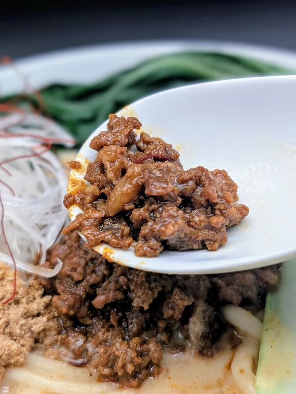 付属トッピングの肉味噌はコク深く通常品よりもやや甘めで、筍のコリコリ食感とピリリとした辛味も良いアクセントとして機能しています。