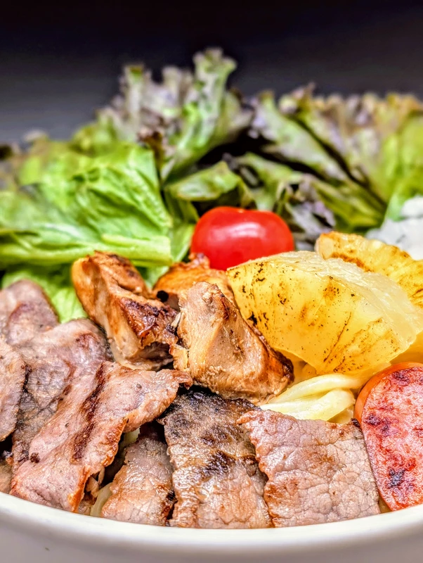 付属トッピングは牛肩ロースと鶏モモのスライスが計約70gとボリューム満点。