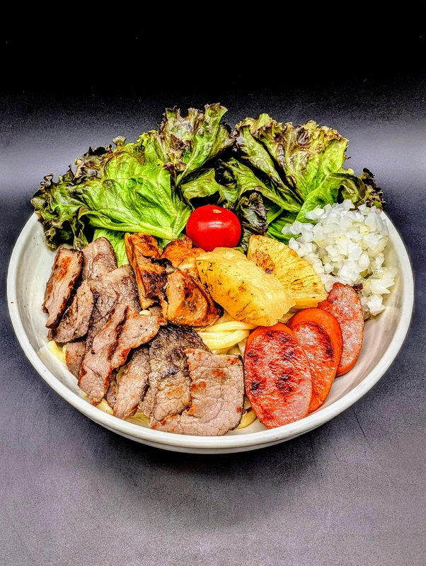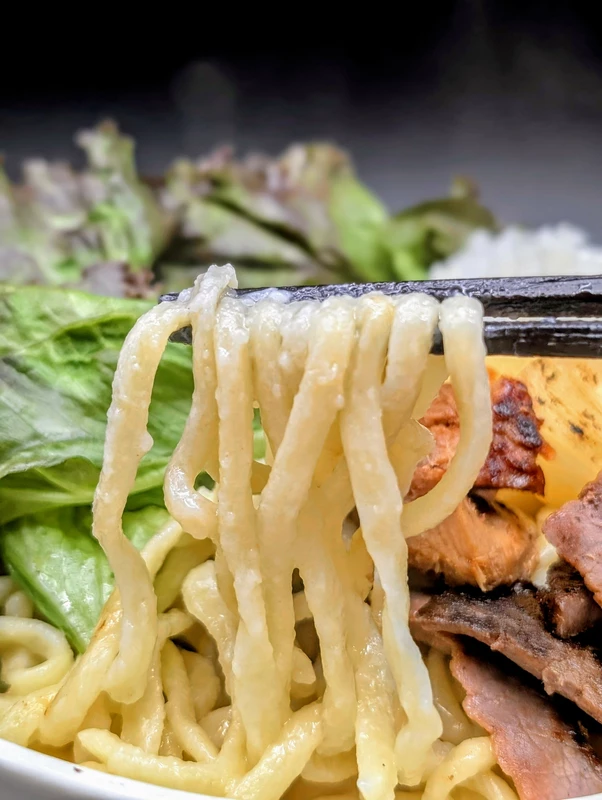 乾物ベースの円やかな塩味のタレ。そこにモチモチの中太ストレート麺をよく絡めて啜るとそれだけでも美味しくいただけます。しかしなんと言っても主役はシュラスコで、フライパンで炒めると牛肉は薄切りながらも肉の旨味が感じられ、鶏肉は皮目がパリパリで弾力のある肉質が楽しめます。おすすめトッピングのレタス、玉ねぎは必須で、途中でビネガーを加えるのも味変で楽しめます。