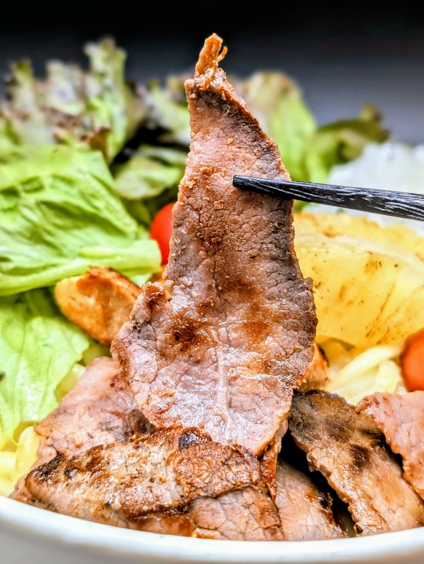 生野菜がないとオイリーさが目立つアンバランスな未完成品となりますが、生野菜をトッピングするとタレや肉と絡む事で油分を中和し、味わいがすっきりまろやかに、かつ肉の旨味と香りを十二分に引き出してくれます。