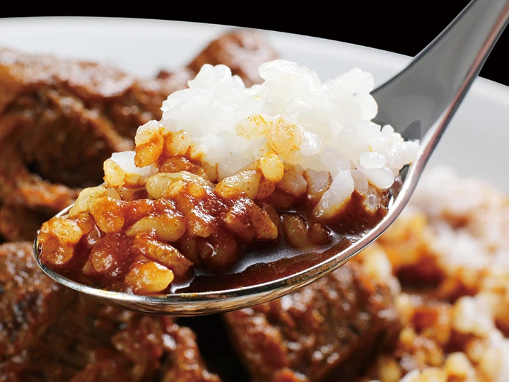トロトロほろほろの超絶品牛ホホ肉は、驚きの1人前150グラム。そのまま食べても十分に満足できるレベルの質と量。長時間煮込まれた、牛ホホ肉を、サラリとしたカシミールカレーに絡めると、肉の旨みをしっかりと感じながら、辛さも同時に楽しめる。付属のライスもまるで炊き立てのようなみずみずしさと、甘みで、肉、カレーソース、米の最強三位一体が完成する。