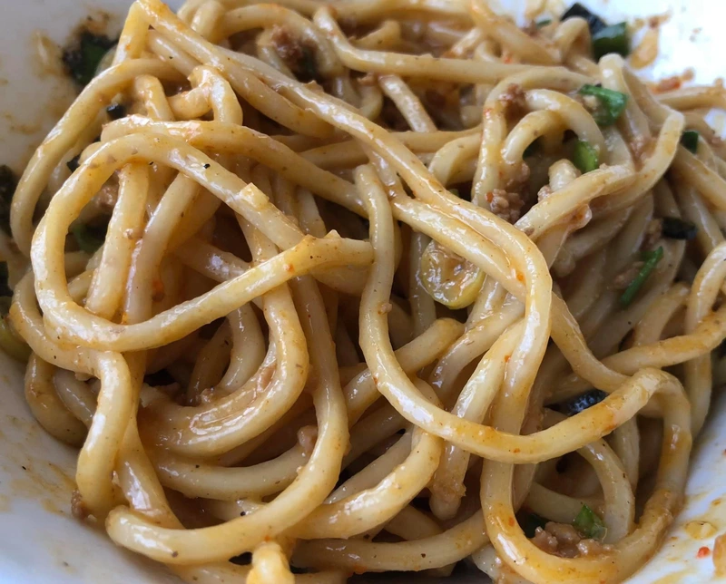 もちもちして食べ応えのある麺に魚粉と辛肉ミンチが絡みそこにニンニクの風味やニラ、ねぎが合わさって美味しすぎて夢中で食べました。