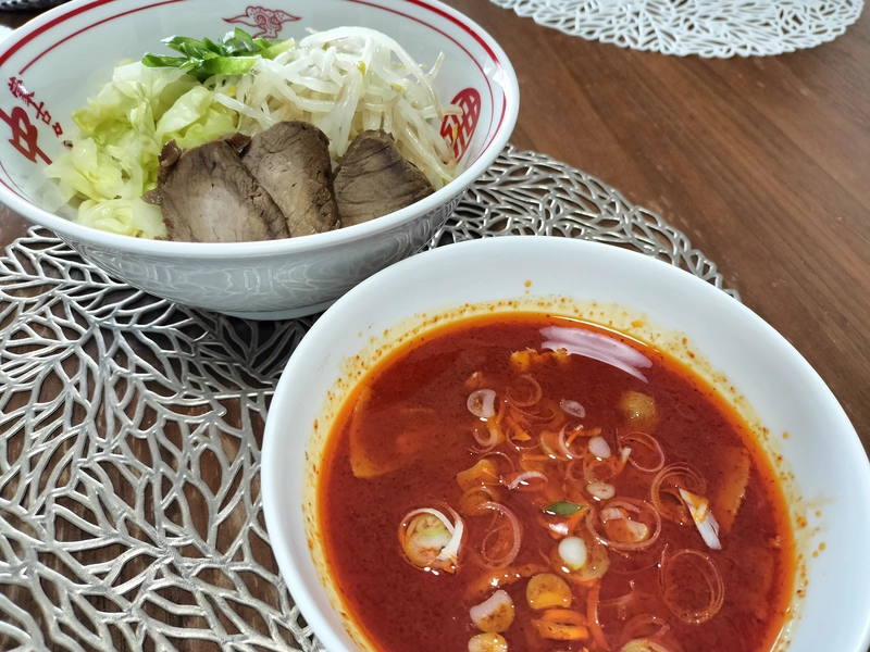 自作のチャーシュー、もやし、キャベツ、ネギをトッピング。麺は中◯同様冷やしの方がツヤツヤもちもちで美味しいです。ファイヤー味噌たんめんが辛さレベル8だとしたら、つけ麺は辛さ11くらいでしょうか。結構辛いです。麺の量が200グラムと多め。暑い夏におすすめです。