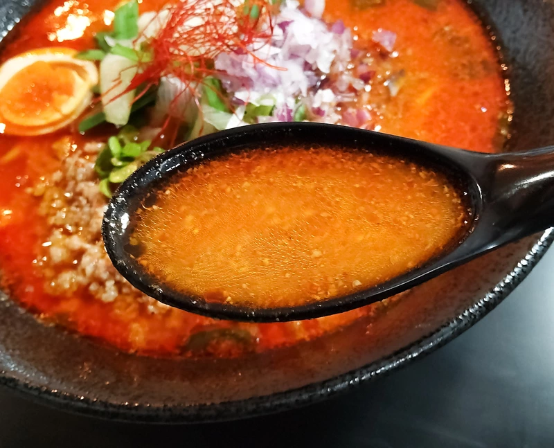 スープは辛さの中に旨味を感じられて美味しい。