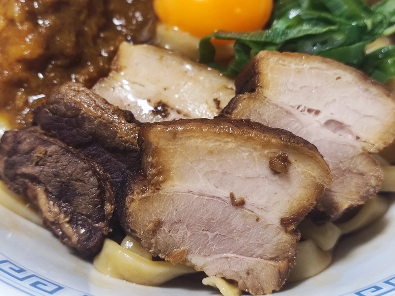 肩ロース2種。炭火焼きと低温調理のチャーシューはどちらも食べ応え、肉質、弾力◎