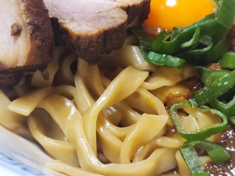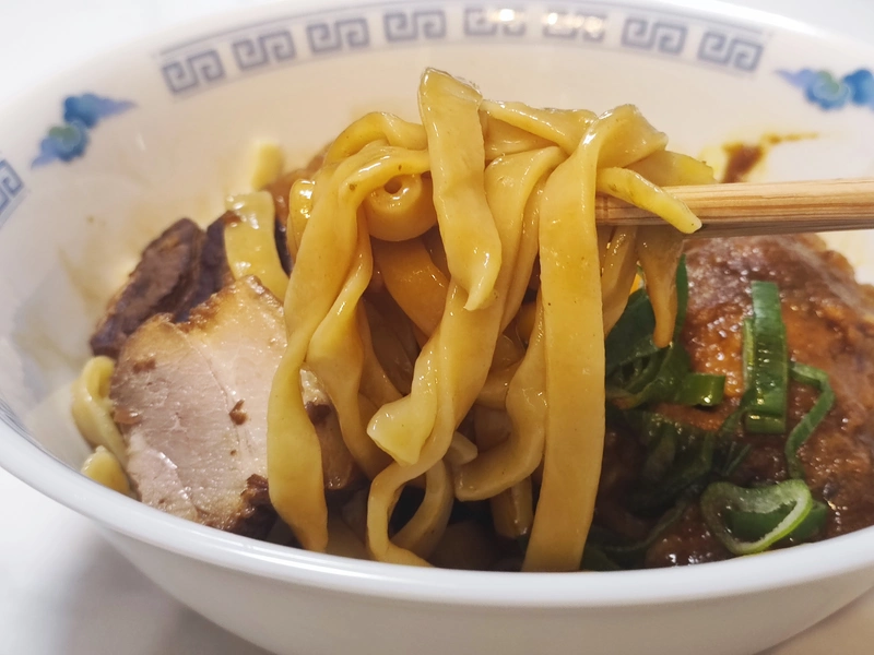 超超極太平打ち麺は外側ふわっと中モチモチで、他店ではほぼ味わえない麺です。