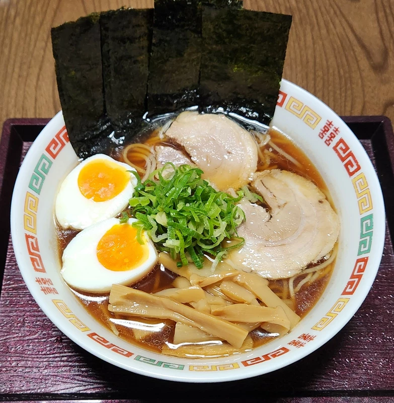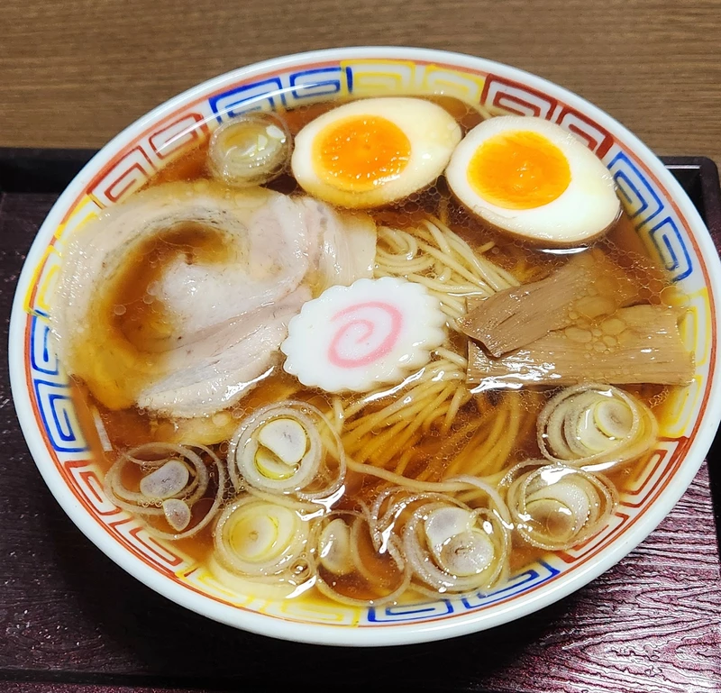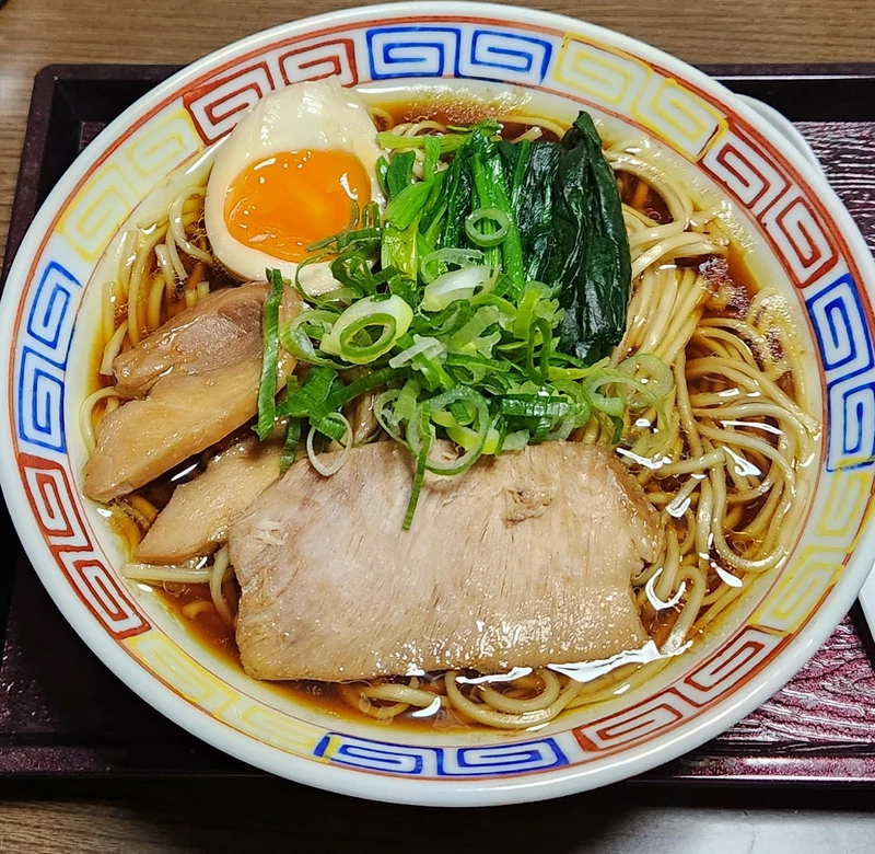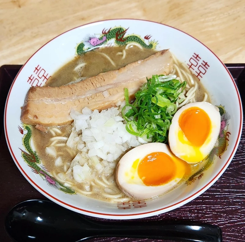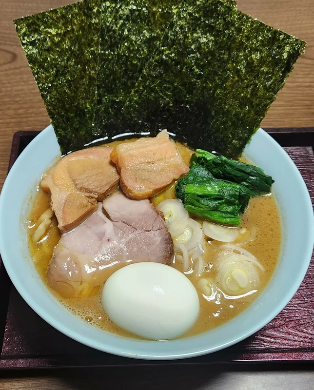 ホウレン草、大きめチャーシュー、ネギ、メンマ、味玉別トピ