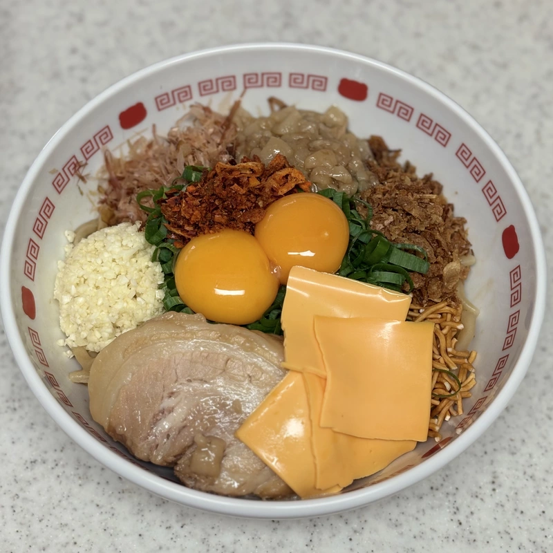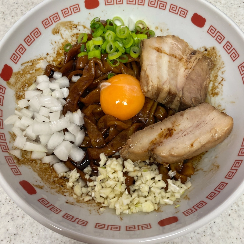 濃いめのタレが極太縮れ麺に絡むように全体を混ぜると卵黄とにんにくがジャンク度をアップしてめちゃくちゃ美味しいやん😆