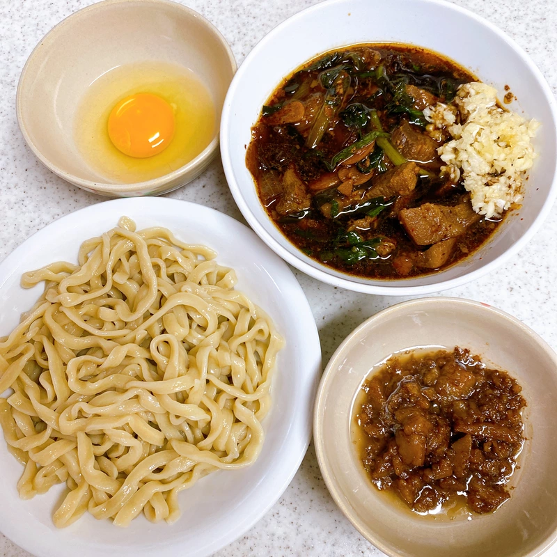 ゴワゴワ麺をいつもより辛味が強めの濃厚なスープにつけて食べるとめちゃくちゃ美味しいやん😆もう最高💯
