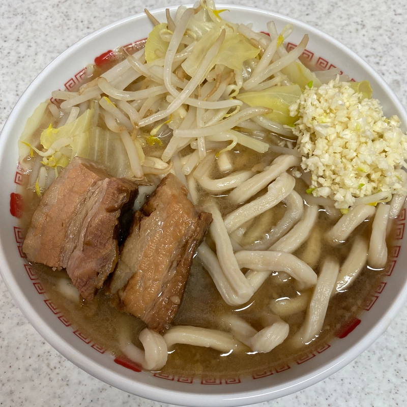 にんにくで環七背脂チャッチャ風、玉ねぎで燕三条煮干風を選べるそう。にんにくと玉ねぎを入れて合体させてみると、ほうとうみたいな超極太平打ち麺がスープにマッチしていてめちゃくちゃ美味しいやん😆これは過去最強の極太麺やね🤩