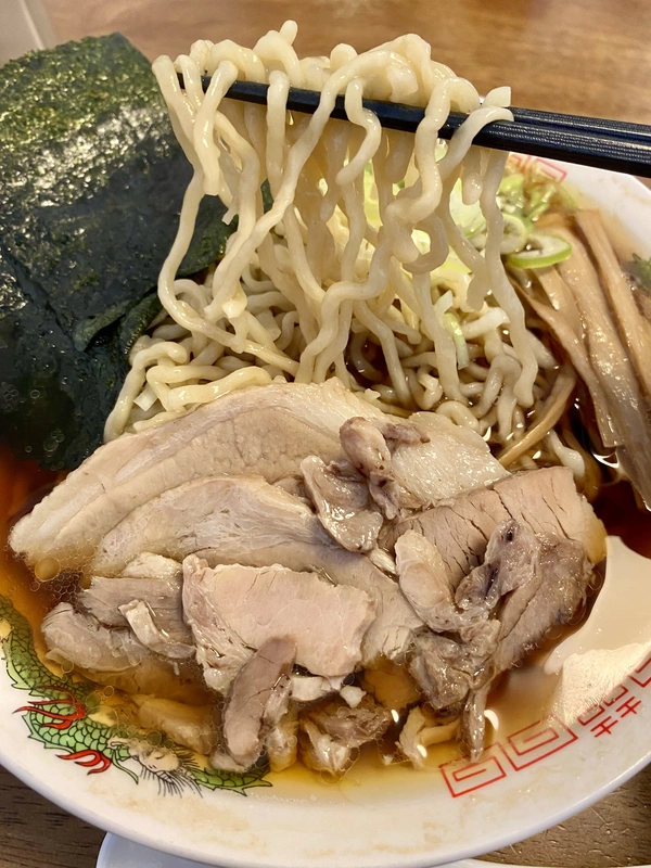 ホロホロのチャーシューにたっぷりめのメンマ、これに細麺が絡むとたまりません。