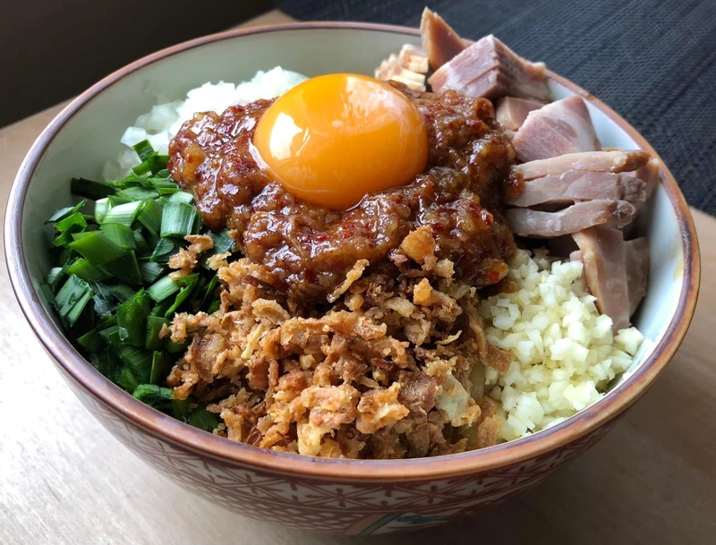 ニラ、刻みタマネギ、ニンニク、卵黄、追いチャーシューは自前です。
