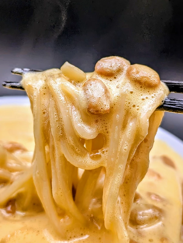 ツルモチの食感と優しい甘味がスープとマッチしており、量も240gと二郎インスパ並みの重量感。