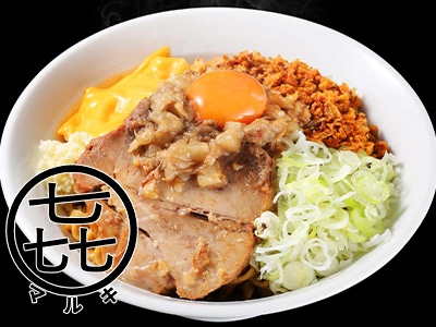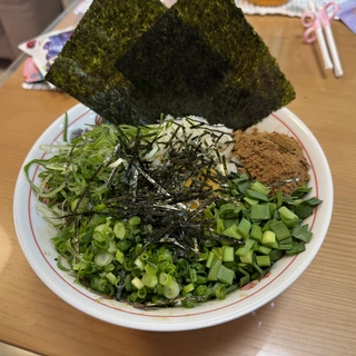 ベースのたれは複数のスパイスにカレー粉といった、 オーソドックスなもの。 ほんのり醤油や魚介の風味を感じる和テイストな仕上がり。 麺は中太と太麺の中間くらい。 加水率低めのゴワワシ食感。 特筆すべきはうで肉の豚。 1枚というより1塊ともいうべき巨大なもの。 厚さ3cmくらいで食べ応えあり。 味付きアブラはこちらに同梱。 別で用意したのは、もやし・キャベツ・ねぎ。 スパイスエシャロットは程よいアクセント。 そこまで塩分が強くないので、 濃いめが好きな人は野菜少なめ推奨。 また、胃に余裕があるなら追い飯もアリ。 中盤以降の味変として、 一味唐辛子、山椒、お酢を少量ずつ加えてみた。 美味しく完食。