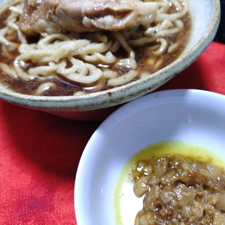 にんにくで環七背脂チャッチャ風、玉ねぎで燕三条煮干風を選べるそう。にんにくと玉ねぎを入れて合体させてみると、ほうとうみたいな超極太平打ち麺がスープにマッチしていてめちゃくちゃ美味しいやん😆これは過去最強の極太麺やね🤩
