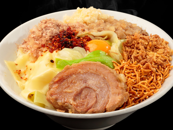 箸で持つと、その大きさに驚く豚の重さは、80gオーバー、まさに規格外、常識外だ。驚くべきは、その大きさ、重さのみならず、柔らかさ、ジューシーさ。 豚の旨みが信じられないほどに詰まった、病みつきの味わいだ。また、バリエーション豊かな付属のトッピングは、混ぜれば混ぜるほどに、 その食感、味わいを複雑化させ、楽しみが広がる。更に、チーズ、唐辛子、マヨネーズなどのトッピングを用意すれば、楽しみ方は無限だ。 しっかりと旨みを抽出したベースのタレに、バリエーション豊かなトッピング、規格外の豚が加わり渾然一体、まさにジャンクフードの極みと言える!